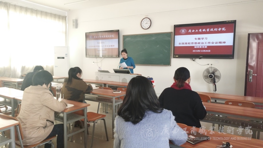根据公司《关于组织全体教职工学习全国高校思想政治工作会议精神的通知》要求,2016年12月27日下午3点,继续教育部在校本部2413教室开展专题学习,学习全国高校思想政治工作会议精神。会议由继续教育部主任、党支部书记高洁同志主持。