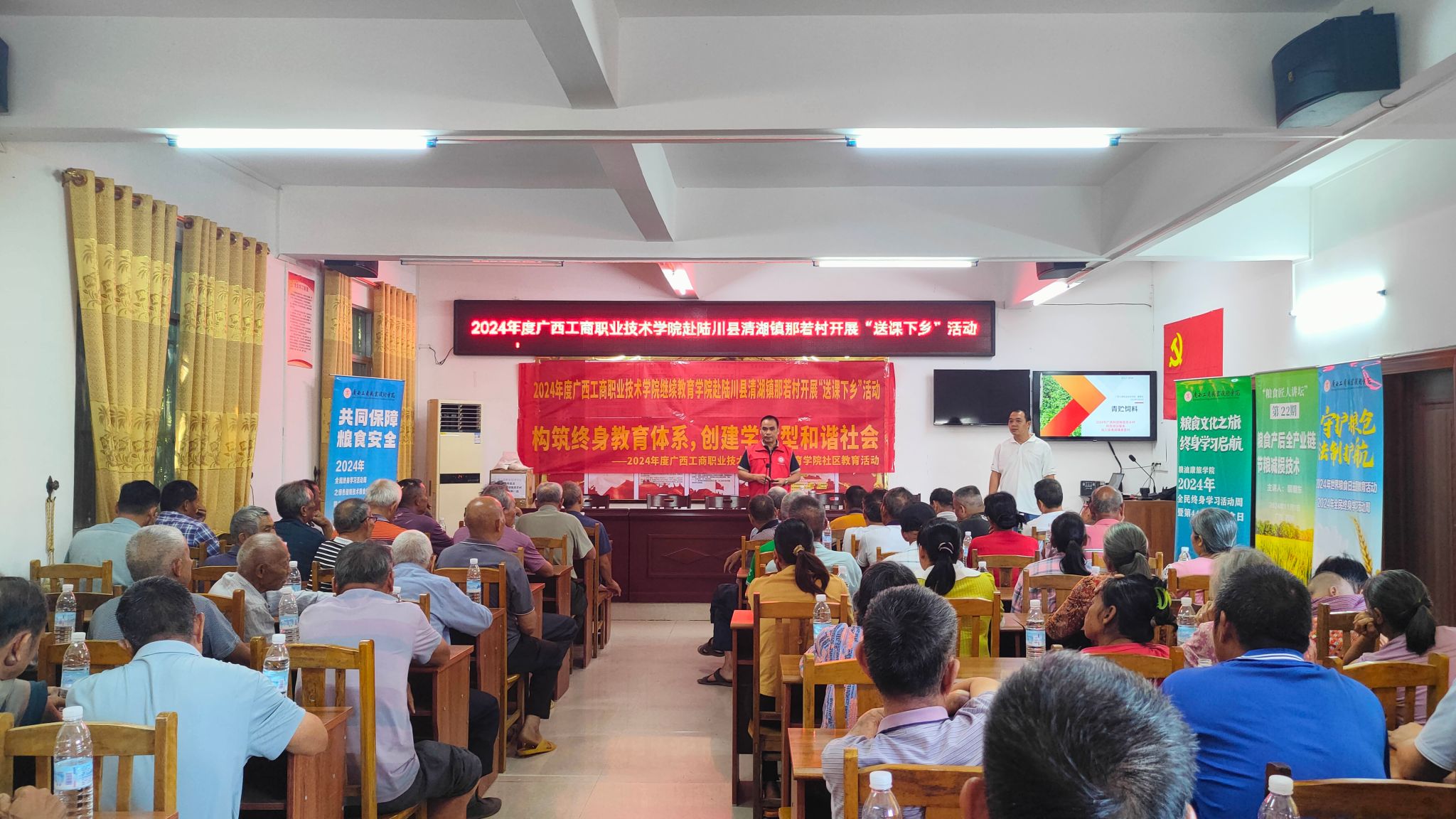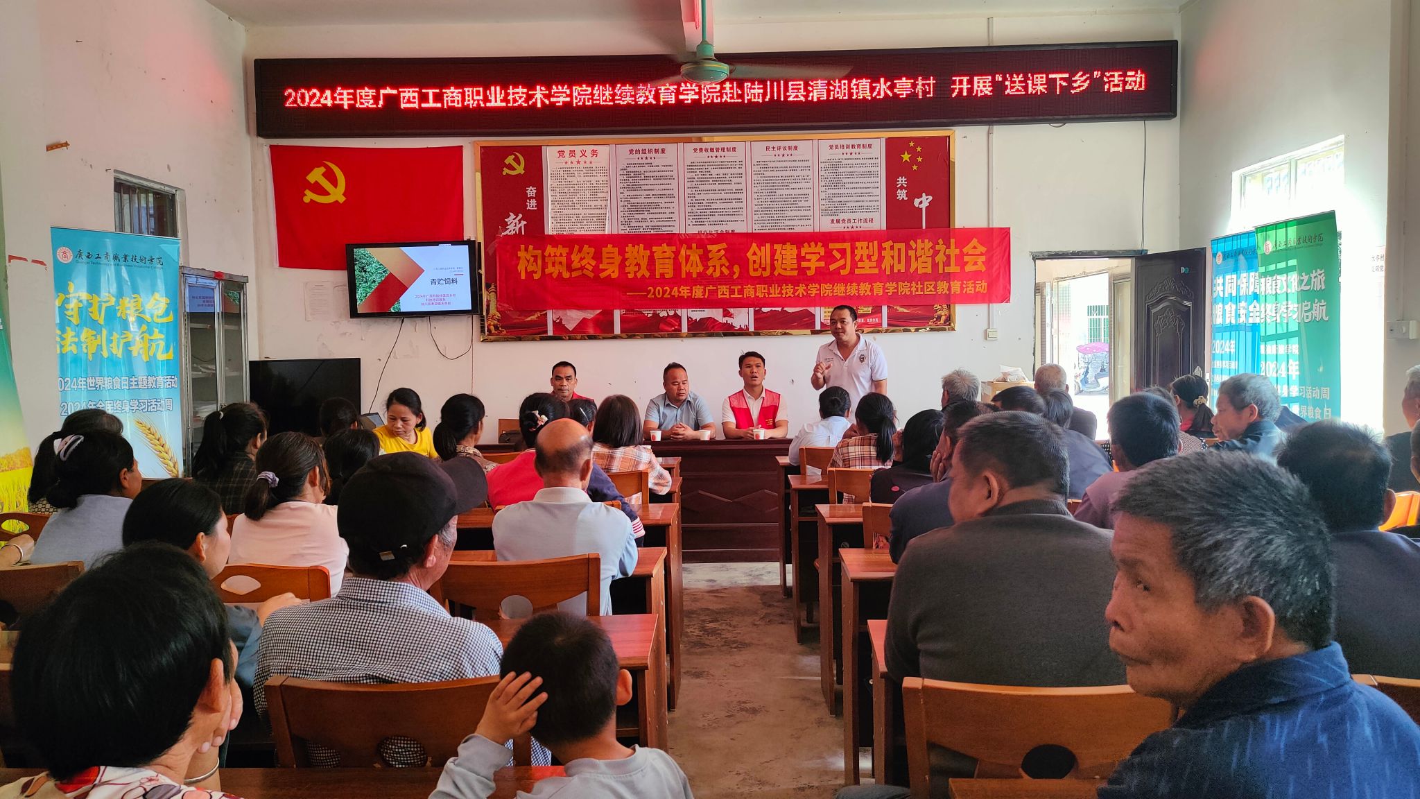 更好地服务乡村振兴战略、推动经济高质量发展,充分发挥继续教育学院社会服务职能,bevictor伟德党支部书记李朝锋同志、粮油康旅公司副经理裴朝东同志等一行5人于20241118-19日赴玉林市陆川县清湖镇那若村和水亭村开展“送课下乡”活动。