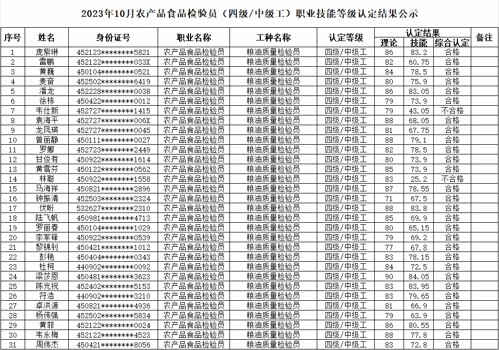本次农产品食品检验员四级/中级工职业技能等级认定共有31人申报,其中,29人认定结果为“合格”,2人认定结果为“不合格”。认定过程严格按照广西壮族自治区职业技能鉴定中心颁布的《广西职业技能等级认定工作指南》及有关规定执行。现将鉴定结果予以公示(如下图所示),公示时间为2023年10月23日至2023年10月27日。公示期间,如对结果存在异议,可通过信函、电话、传真等方式反映,联系人:刘老师、蒋老师,联系电话:0771-6797182。