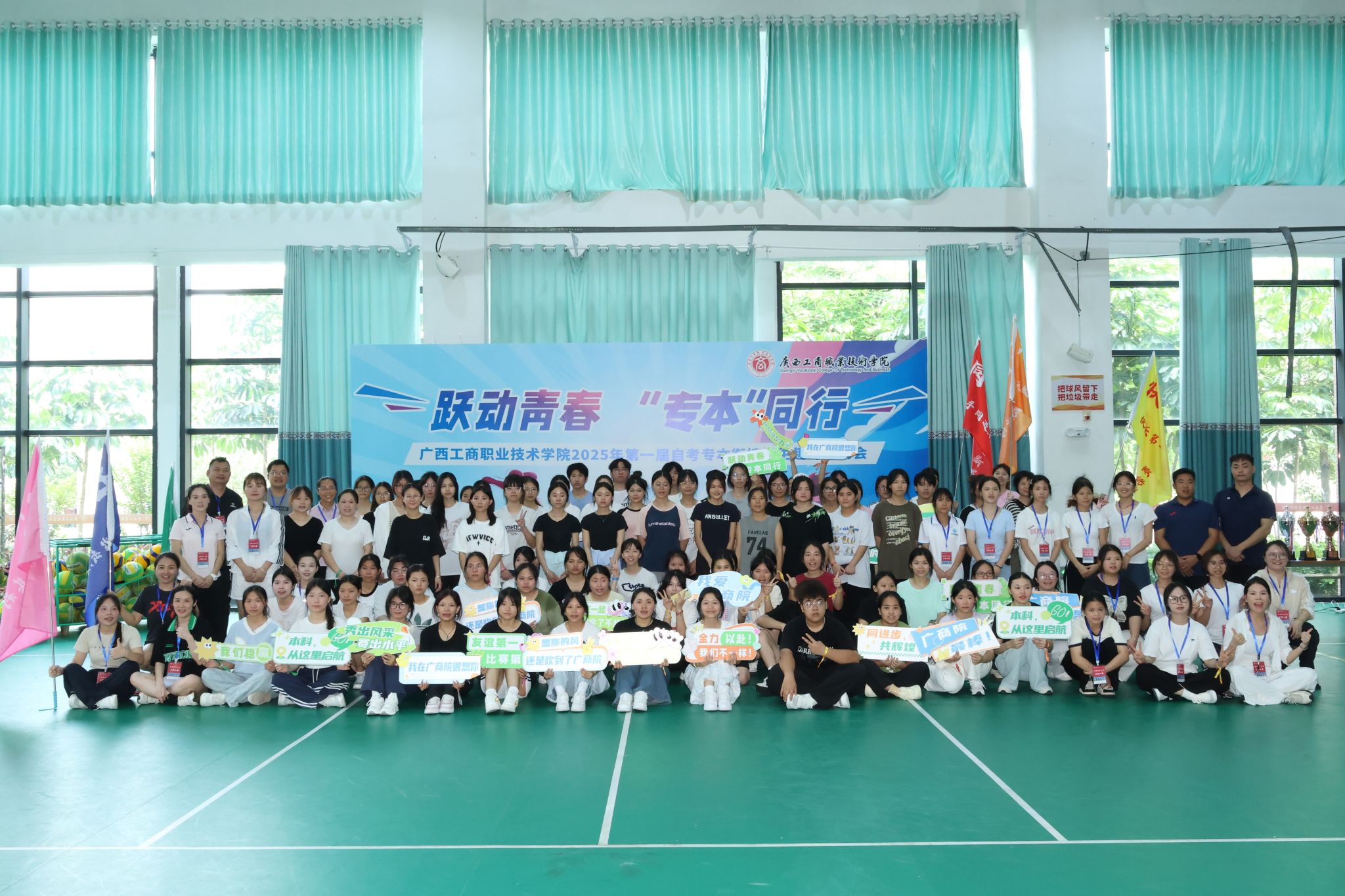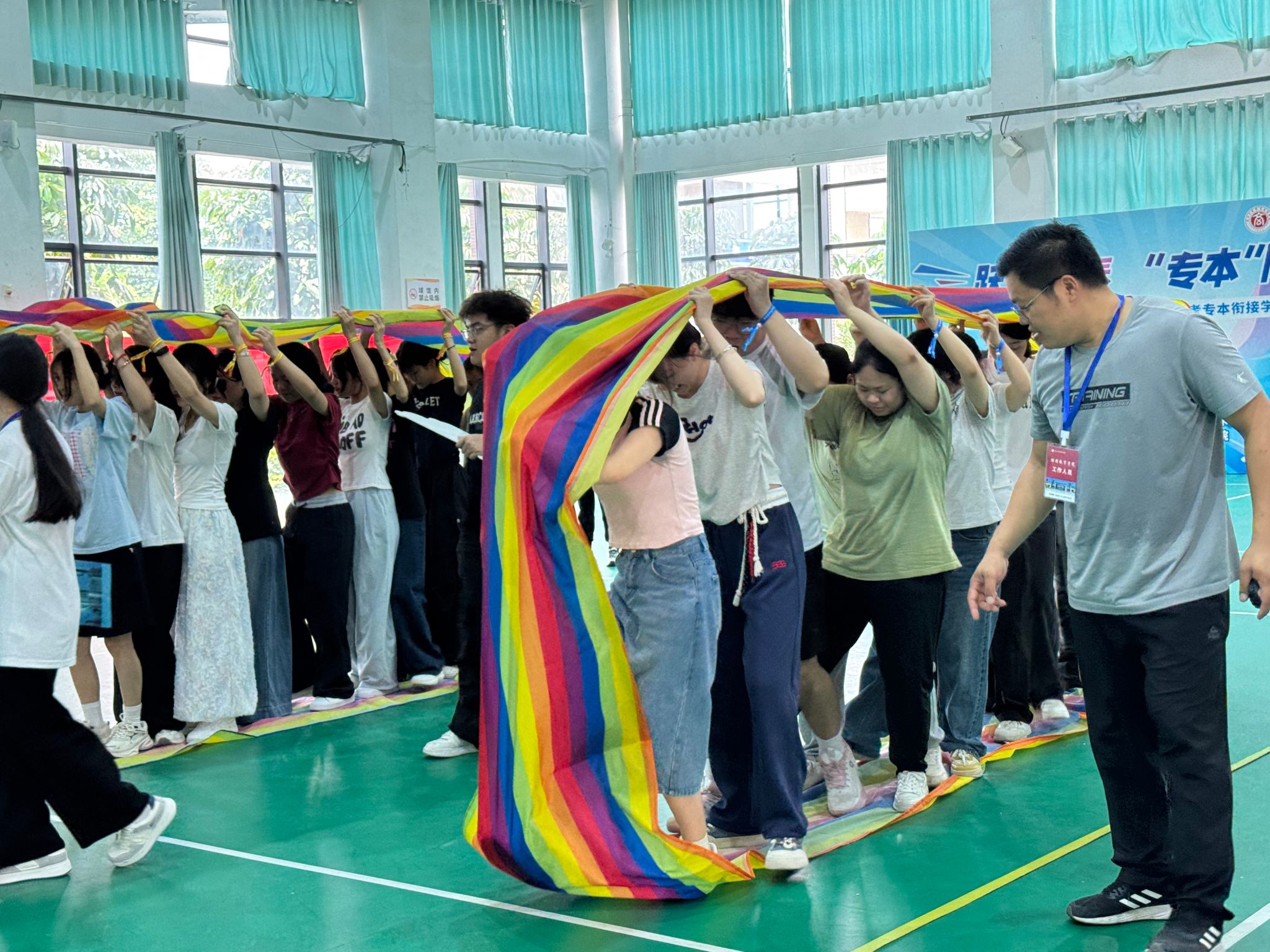 6月21日上午,武鸣校区老员工活动中心欢声笑语此起彼伏,以“跃动青春,‘专本’同行”为主题的2025年首届自考专本衔接员工趣味运动会热烈举行。来自专本衔接项目的在校员工组成6支队伍,在5项团体赛中展开趣味角逐,展现青春活力与团队协作精神。活动当天共有150余名师生参与。